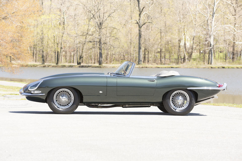Dating from the first few months of production this example is one of the earliest surviving left hand drive jaguar e type roadsters the chassis number sequence commenced at 875001 and has features typical of these early production models including the flat floor welded bonnet louvres and external bonnet locks.
